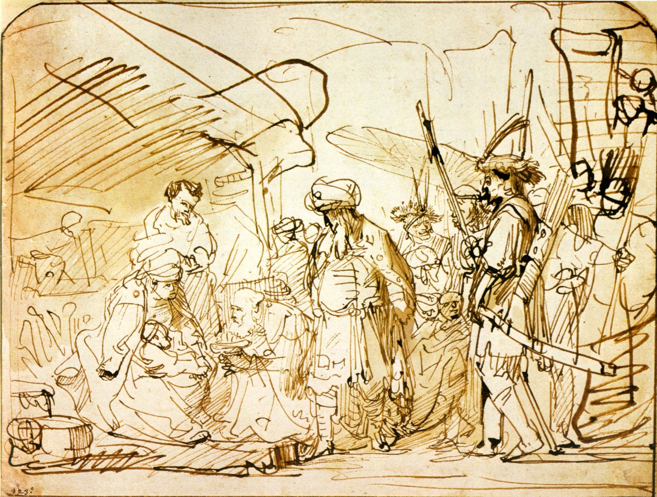 [Rembrandt, Anbetung der Weisen, um 1638, Federzeichnung.] |