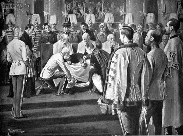 (Im Bild: Kaiser Franz Josef wäscht am Gründonnerstag 12 armen Männern die Füße.)
