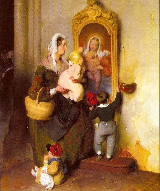 sie ihre kleine Tochter auf den Arm nimmt und sie ganz nah an das Bild hält — was die Heilige Jungfrau durch eine ähnliche Geste zu beantworten scheint.