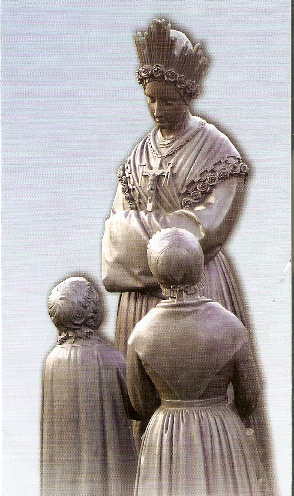 Sie geht einige Schritte auf die Kinder zu, und diese ihrerseits kommen den Hang herunter und treten ganz nahe heran. So können sie die Gestalt genau sehen. Sie ist groß und strahlt in hellem Licht. Sie trägt ein langes, weißes Gewand, eine gelbe Schürze, ein Halstuch und eine einfache Haube. Auf ihrem Haupt leuchtet ein Diadem und auf ihrer Brust ein Kreuz mit Hammer und Zange an dem Querbalken. Aller Lichtglanz geht von diesem Kreuz aus. Wer ist sie? Die Kinder wissen es nicht. Sie sprechen später immer von der „Belle Dame“, der schönen Frau. Nun beginnt sie zu sprechen: