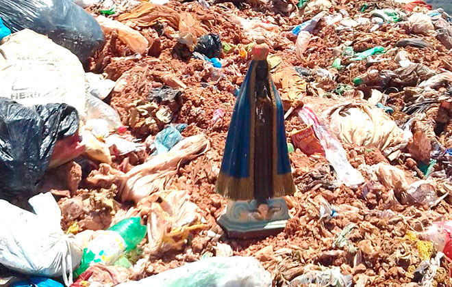 Angestellte der Müllabfuhr hatten auf der Mülldeponie von Patos de Minas letzte Woche eine Überraschung. Unter dem gepressten Müll fanden sie eine Statue Unserer Lieben Frau von Aparecida praktisch unversehrt. Der Fall zog Aufmerksamkeit auf sich, da der in der Stadt gesammelte Müll verschiedene Verdichtungsprozesse durchläuft. Die Statue wurde am Dienstag (den 7.11.) von Supervisor Amarildo Ribeiro Silva und dem Trimmeroperator Osmar Pio gefunden.