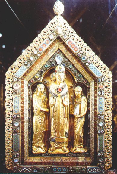 Front des Servatius-Schreines aus dem 12. Jahrhundert mit Servatius, flankiert von Engeln,in der Servatius-Kirche in Maastricht |