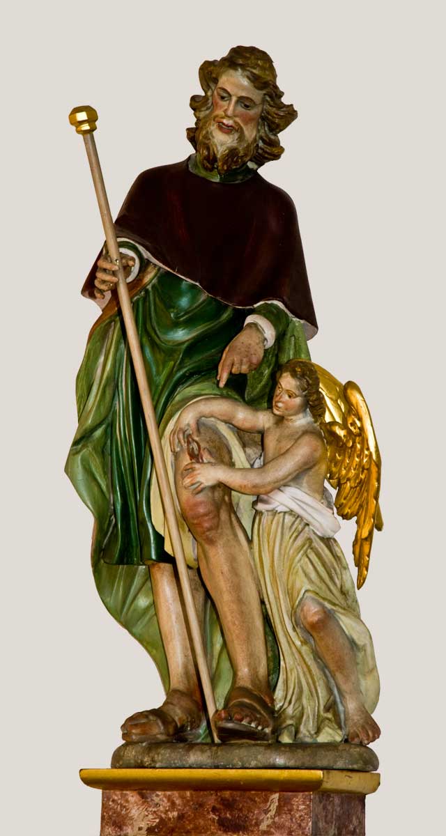 Jahrhunderten einer der beliebtesten Pestpatrone war. Obwohl sichere Überlieferungen über das Leben von Rochus fehlen, obwohl er nie ein Amt innerhalb der Kirche innegehabt hat, gehört er bis zum heutigen Tag zu den volkstümlichsten und vielverehrten Kirchengestalten.