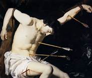 als Soldat zu sehen; er ist an einen Baum gebunden und/oder von Pfeilen