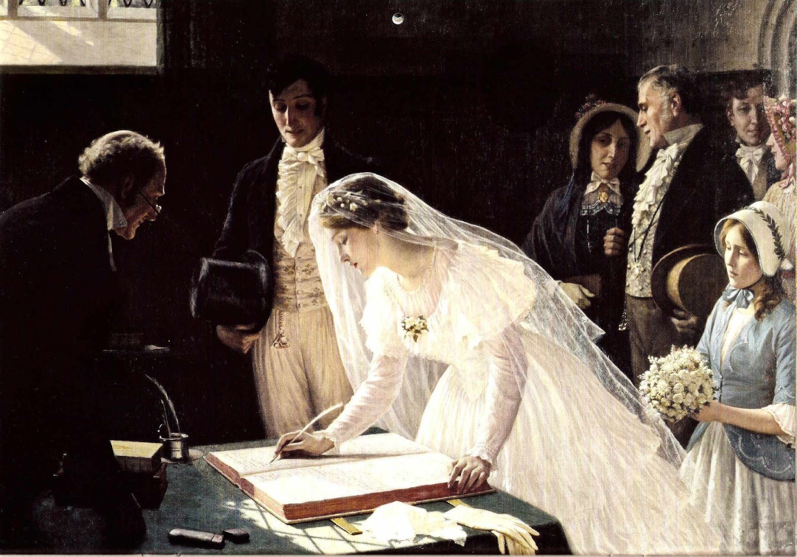Braut, die der Mittelpunkt des Gemäldes ist. Vor dem Standesbeamten gibt sie im